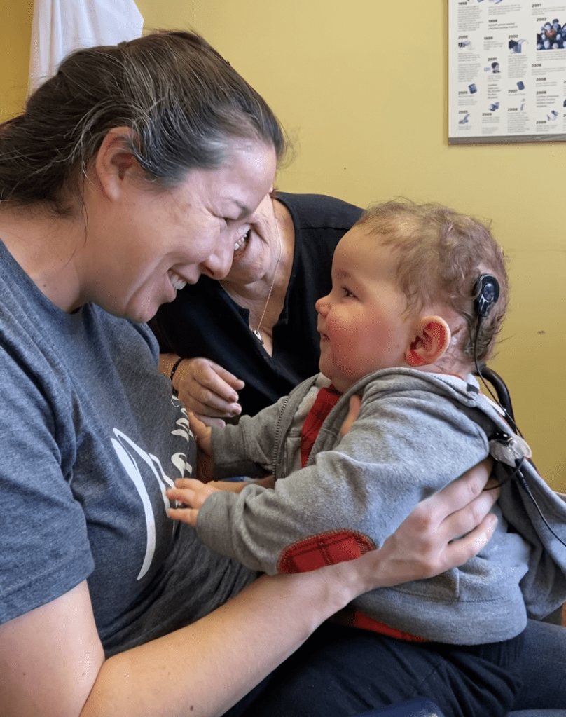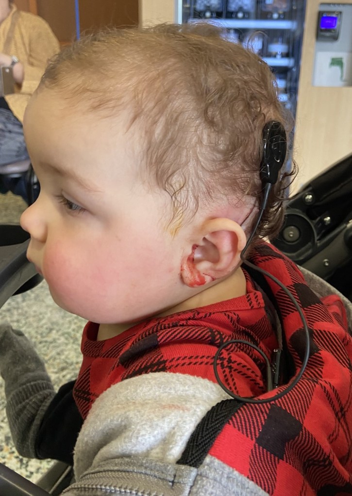 François entend maintenant des sons, cependant, ceux-ci manquent de clarté. Il ne différencie probablement pas ma voix de celle des autres. Avec le port de ses appareils en tout temps (sauf lorsqu’il fait dodo), de l’entraînement, du temps et beaucoup de persévérance, la compréhension de la parole et des sons environnants vont s’améliorer. Il doit apprendre à donner un sens aux sons entendus par le biais de l’implant. Pour ce faire, nous allons devoir retourner à Québec dans 2 semaines pour 4 jours de programmation initiale intensive et ensuite faire 12 semaines de réadaptation fonctionnelle intensive (RFI) en région pour qu’il puisse utiliser et développer de façon optimale la nouvelle audition apportée par l’implant.