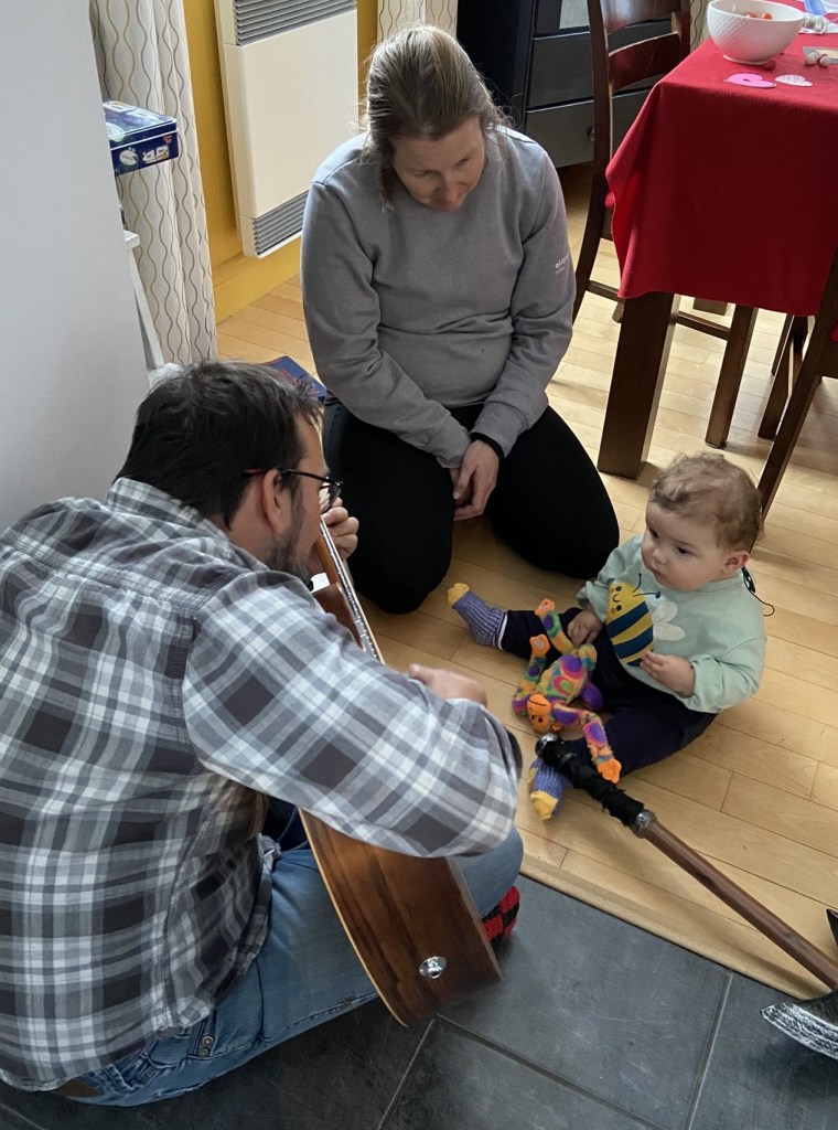 Richard, mon beau-frère, a sorti sa guitare pour lui jouer de la musique et pour la première fois, j’ai acheté un jouet musical (un petit piano/tambour) en sachant que maintenant, mon fils va pouvoir l’apprécier. C’est d’ailleurs rapidement devenu son jouet préféré. J’ai aussi crié de joie de voir François faire le saut quand mon ami qui nous a rendu visite a cogné à la porte. Ce fut sa première grande réaction au son environnant!