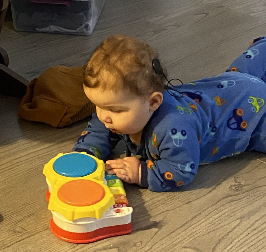 Pour l’instant, le volume de ses appareils est très bas pour l’habituer tout doucement. J’ai une petite manette que je traine partout avec moi qui me permets d’ajuster le volume. L’objectif est de monter graduellement le volume pour atteindre le niveau 10 (le niveau maximal) d’ici quelques jours. Une fois ce niveau atteint, les appareils resteront toujours à 10. Un petit truc que l’audiologiste m’a donné est de frapper fort dans mes mains lorsque je monte le volume d’un cran : si François cligne des yeux, c’est que le son est trop fort. Dans ce cas, je dois redescendre le volume, attendre un peu (ça peut varier entre quelques minutes et une journée), remonter le volume et refaire le test.